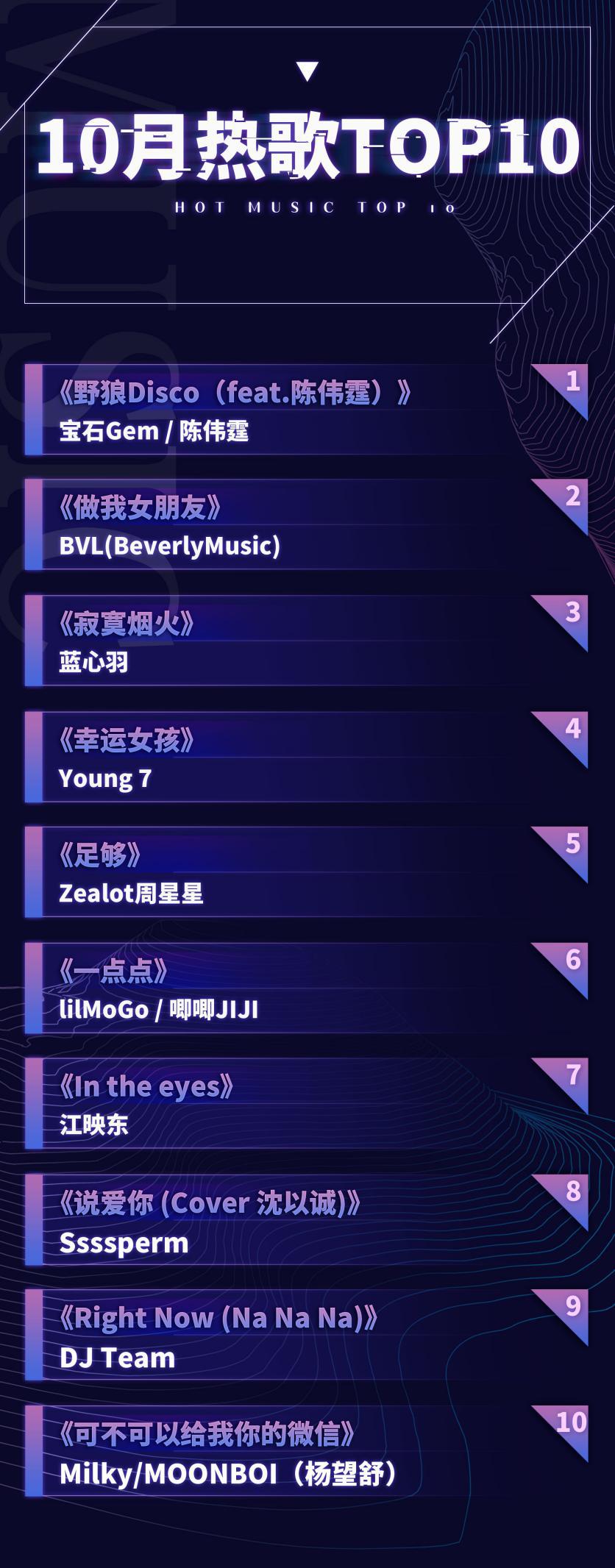 小编特意整理了10月热歌TOP 10